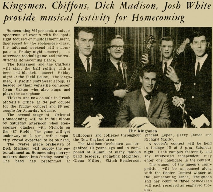 The Transit being the best source of information on parties and posters, The Poly pointed to the bands! An article about The Kingsmen, Chiffons, Dick Madison and Josh White providing music for Homecoming was a welcome discovery. Check out this party poster! The Kingsmen were from the west coast though, so how big were these parties? Better yet, what was the Burdett drag strip like?