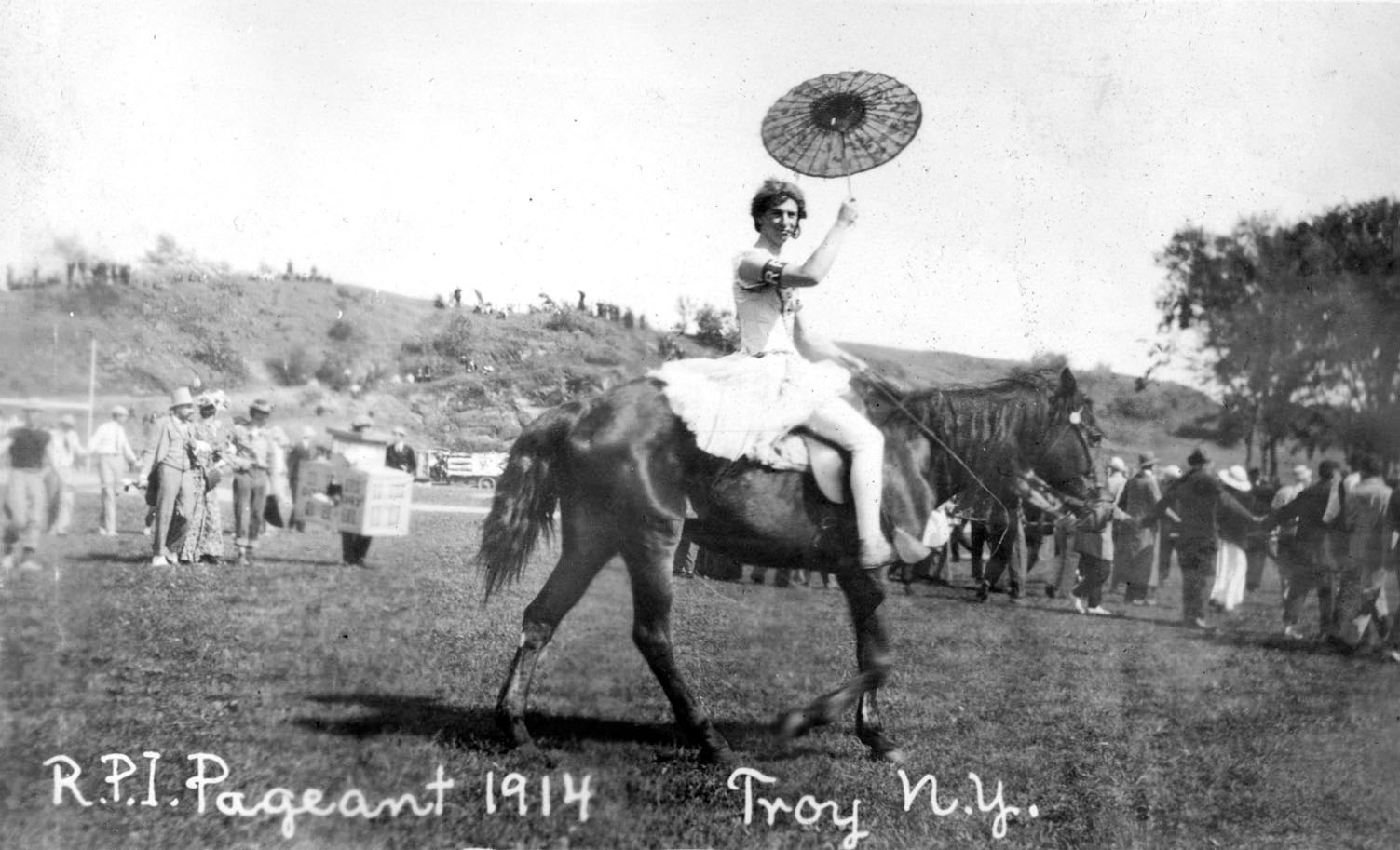 Therefore, in 1914 the students advocated for the graduating class to become more acquainted with returning alumni and for alumni to feel more at home on the new campus situated upon the hill.  The students asked that every Rensselaer man, graduate or undergraduate, make an effort to take part in a Grand Pageant and that all classes dress in costume! Student on Horseback, Pageant, 1914