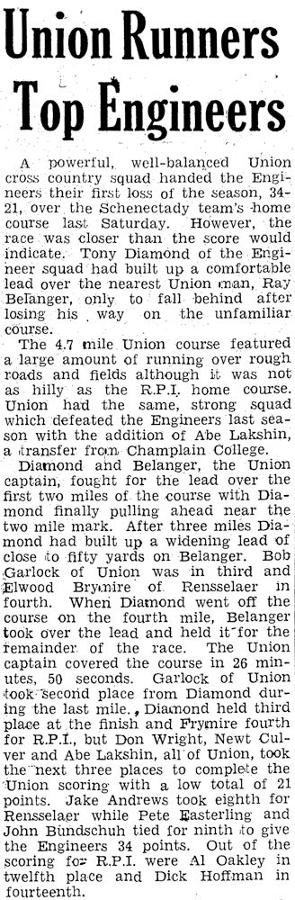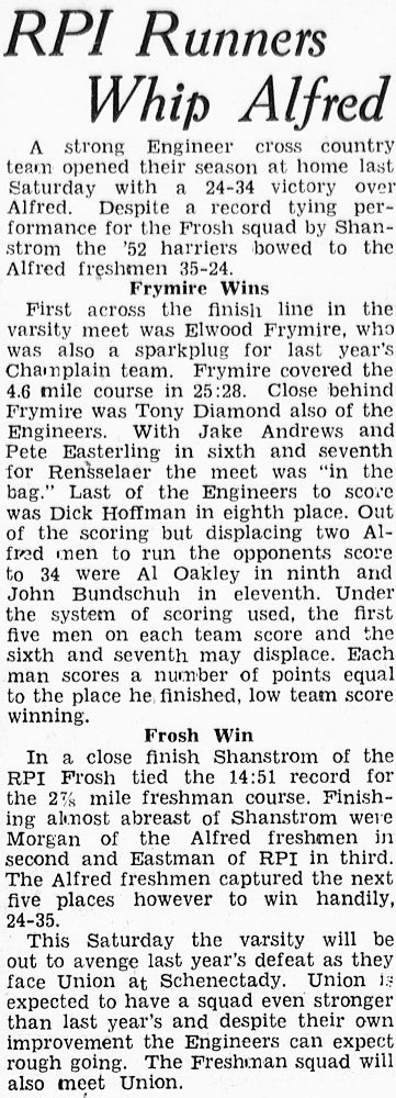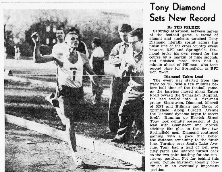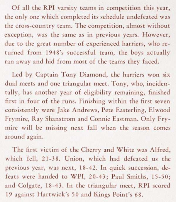 Back to RPI’s cross country team. In the 1940s the Institute had both freshman and varsity squads. Tony’s 1947 frosh team went undefeated, and Coach William Eddy had high expectations for the varsity program when the freshmen runners moved up in 1948. However, the varsity team lost its first meet that year when frontrunner Diamond went off course. It would be the first and last time Rensselaer’s varsity harriers would lose for the next three seasons.