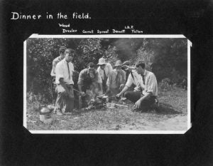 As I pored over the usual array of items, one in particular stood out – an album containing photos of a 1911 student survey in Warrensburg, New York.  At that time  students were required to go on expeditions to develop their surveying skills.  The photos depict students posing with rods and transits and other paraphernalia as well as using the equipment, goofing off, and relaxing in their spare time.  Best of all, each image is neatly labeled, often including names or initials of people in the photos.