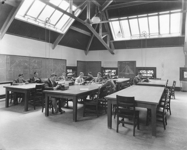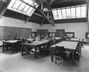 The main entrance is on the third floor, since the building is situated on a hillside. The two lower floors contain a book stack room, rooms for sending out catalogues, for exhibitions of drawings, for storage and janitors' quarters. The main floor contains a book stack room, the reading room, the meeting room for the Trustees and Faculty, and the offices of the President, Treasurer and Registrar. The fourth floor is devoted to the Department of Geology, containing a large museum of geological and mineralogical specimens, and the lecture room and office of the Professor of Geology. One large hall, 100 feet by 64 feet in size, on the fifth floor is used for general meetings and social purposes. Rensselaer Polytechnic Institute Bulletin. vol. 11, no. 3, September 1912, p.11.