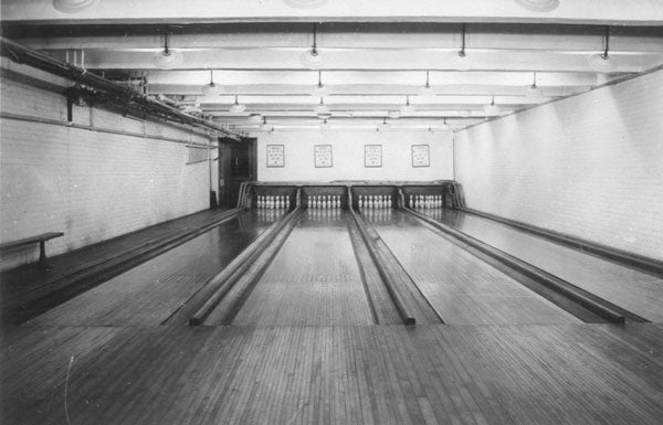 A large L-shaped addition was made to the east and south side of the gym in 1937. The addition included handball courts, bowling alleys, locker rooms, offices, an "exhibition court," running track and a rifle range. Improvements were made to the swimming pool and space for spectators was increased. The addition and building alterations were designed by faculty in the architecture department and the preliminary plans were drawn up by senior architecture students. The project was completed in the spring of 1938.