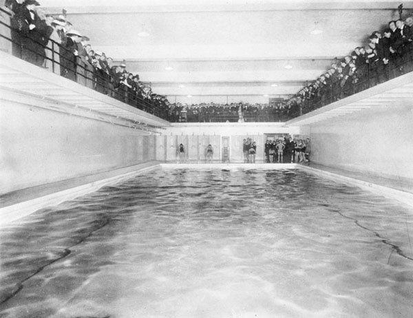 A swimming pool 75 feet by 30 feel is situated in the basement, which is eighteen feet in height. There is a gallery around it. The basement also contains four bowling alleys with a mezzanine floor above on which are shower baths and 800 lockers. Filters for the pool and a wash room are also in the basement. The first floor contains rooms for baseball practice, basketball and fencing, a squash court and the offices of the Professor of Physical Training. Above this floor is a room 125 feet by 64 feet in size with a height of 23 feet to the trusses and 36 feet to the peak of the roof. It is used for general gymnastic practice. A running track encircles this room in a gallery ten feet above the floor.