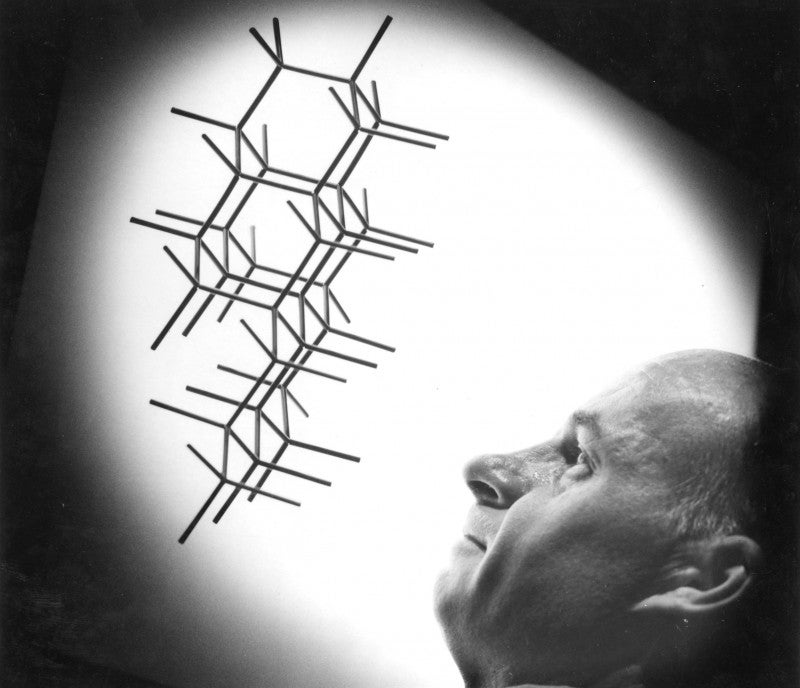 No Sam, not Fred Nachod. The man is Stanley Bunce former Associate Chairman of the Chemistry Department. He is looking at an array of Dreiding molecular models. The array is certainly not graphite but a random arrangement of connected cyclohexane rings that looks nice.