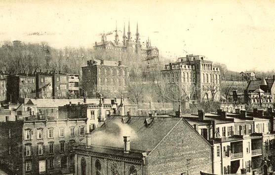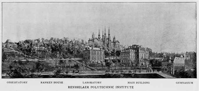 The university is on the hill called Mount Ida, overlooking the city. The view from this site is one of rare beauty and extent. The center building, built in the quasi-Romanesque style of architecture so popular at that time, was two hundred and fifty feet long by about 55 feet wide and four stories high... The crowning architectural features of the building were four tall spires on the corners of the central portion. Because of the location of the building, on the crest of the hill, high over the city, these spires could be seen for many miles in every direction and formed a distinctive part of the landscape becoming known as "The Towers of Troy." [Troy and Rensselaer County, New York: A History, p.304]